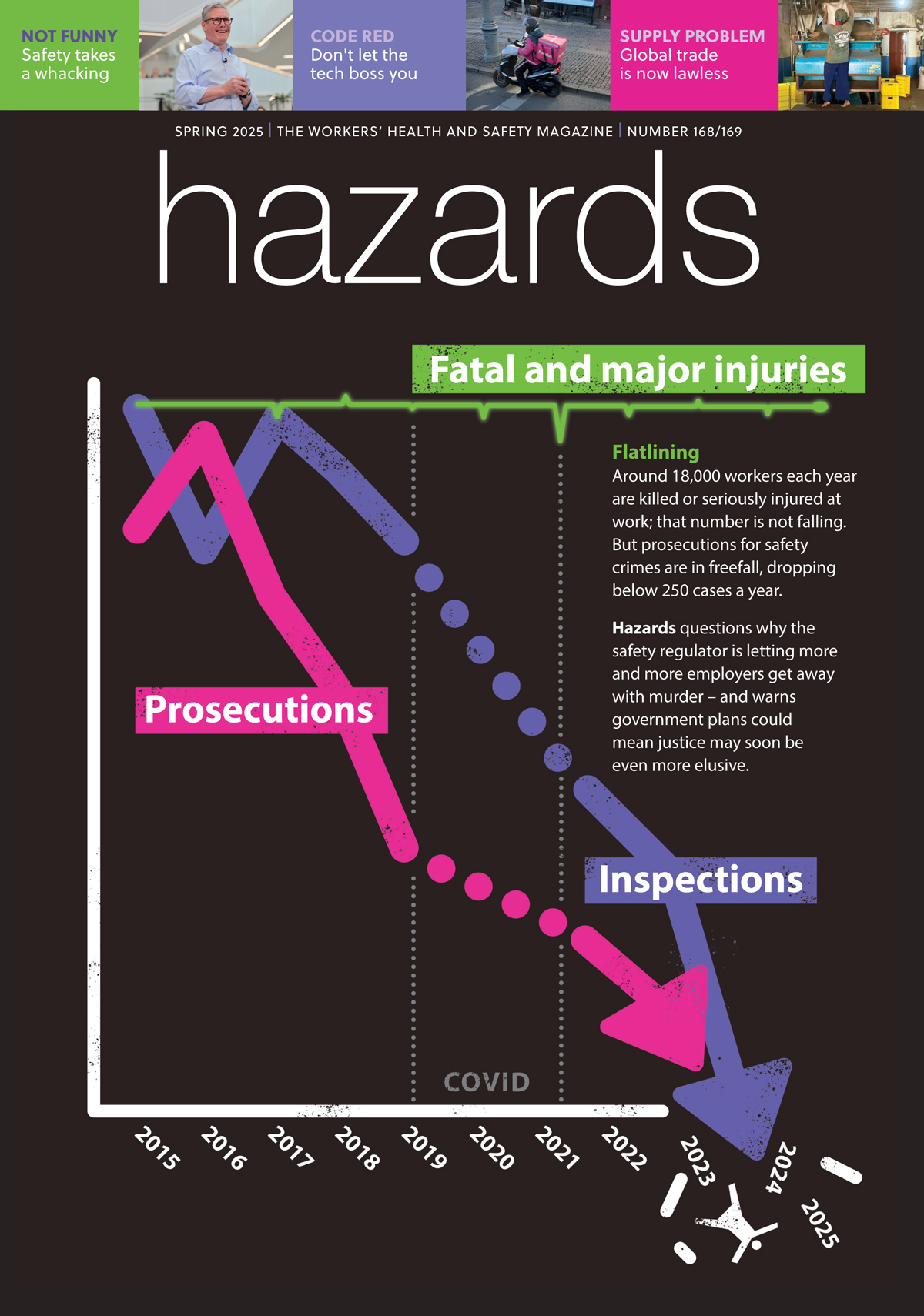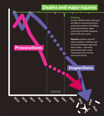 Around 18,000 workers each year are killed or seriously injured at work; that number is not falling. But both prosecutions for safety crimes and inspections are in freefall. Hazards editor Rory O’Neill questions why the safety regulator is letting employers get away with murder.