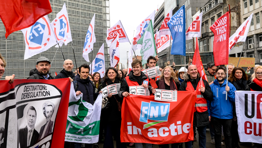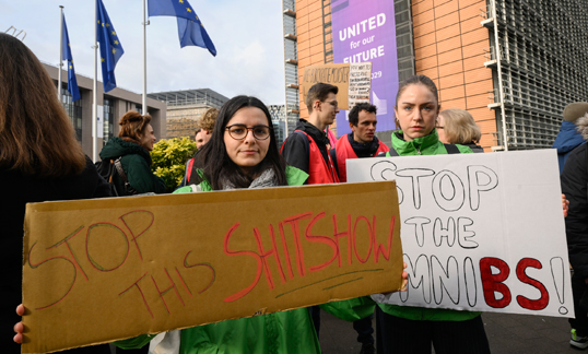 Trade unionists and green campaigners staged a protest in Brussels on 25 February 2025 to tell the European Commission to ‘slam the brakes’ on its Omnibus package which they say is driving Europe towards deregulation and would weaken workers’ rights, safety and environmental protections.