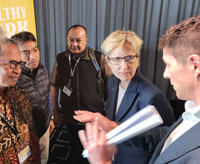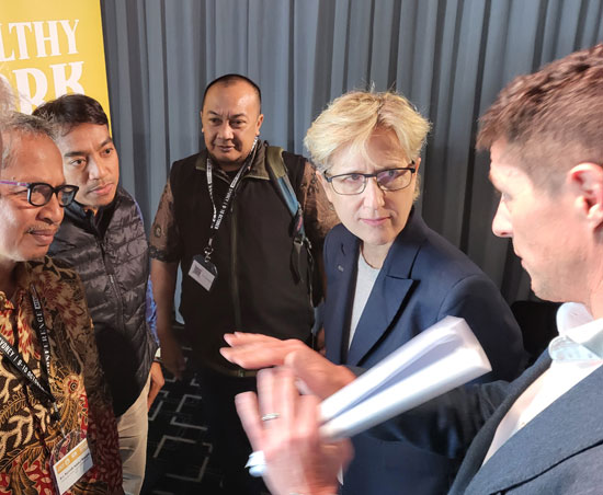 CEMENTING SUPPORT Sally McManus, secretary of the Australian national union federation ACTU and assistant secretary Liam O’Brien (right) discuss the Australian union movement’s support for both the Indonesian campaigners and global asbestos campaign. Leo Yoga Pranata (centre) is one of three LION staff being sued personally by industry body FICMA. Ramidi (left), national secretary of the Indonesian Trade Union Confederation KSPI, is working closely with the ACTU-backed Union Aid Abroad-APHEDA organisation on the Indonesia asbestos action and on just transition.