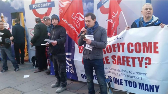 Unite member Daniel Collins was employed by the Costain/Skanska joint venture via an agency on the Bond Street Crossrail station project in February 2015, when he raised health and safety concerns.
