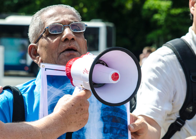 STAND UP Union, safety and environmental advocates stood behind Indian asbestos disease victim Sharad Vittnal Sawant as he addressed the UN Rotterdam Convention conference in May 2015. He said: “I have worked for 40 years at the factory Hindustan Ferodo [now Hindustan Composites], which uses chrysotile asbestos. I am suffering from asbestosis and my wife as well. Another 400 of my colleagues have been diagnosed as well. I came here to request you to put chrysotile asbestos in the PIC List of the Rotterdam Convention.” Four countries, led by Russia, ensured this did not happen.