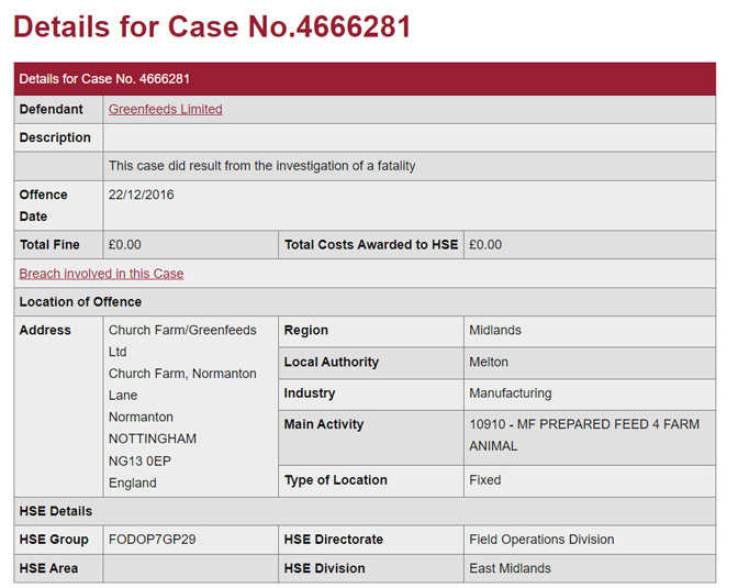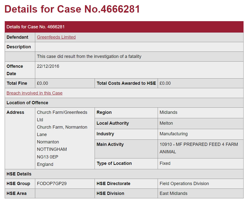 The database, though, in incomplete – and in some cases, plain wrong. The Greenfeeds Ltd case is on the database, but makes no reference to the jailing of two of the company’s owners or a £2m fine after two staff members drowned in 2016 in a tanker of pig feed.