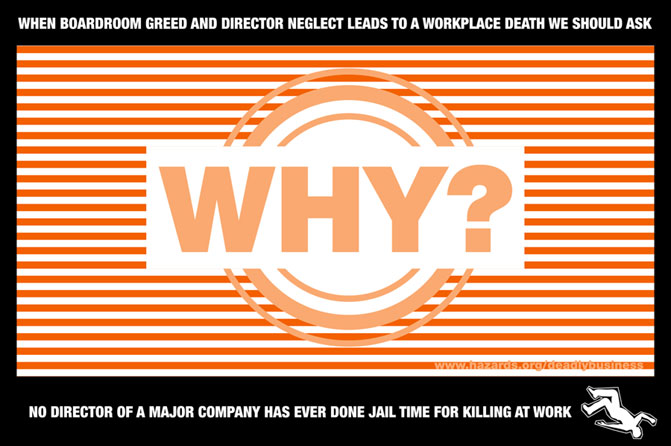 The benchmark is never whether more workers will die, become sick or be injured, it’s whether fewer burdens will fall on business. In the last five years, Health and Safety Executive (HSE) staffing has fallen dramatically, government policy has demanded less enforcement and, this year, the government has backed calls for small businesses to cut back their safety administration to under three minutes a day. At the same time, HSE safety prosecutions, convictions, enforcement notices and investigations of major injuries have all plummeted. It’s just the workplace death rate that has remained stubbornly high. In 2004, HSE had 1,483 “operational frontline inspectors”. This number fell year on year, until by April 2008 the watchdog had just 1,238 inspectors on the workplace beat, a fall of over 16 per cent. Figures obtained by Hazards show the loss of factory and agricultural inspectors in this five year period was more dramatic still, down over 17 per cent from 852 to 706. Offshore inspectors fell from 146 to 116, a drop of over 20 per cent, quarries inspectors from 13 to 9 (over 30 per cent). Numbers of front line inspectors fell in every single sector enforced by HSE. HSE figures released on 29 October 2008 [1], confirmed the number of fatalities have remained significantly higher than the record low of 2005/06, when 217 workers died. Final figures reveal 229 workers died at work in 2007/08, down 7 per cent on 2006/07 but up 5 per cent on 2005/06. The fatality rate of 0.8 per 100,000 has barely altered since 2002/03. The number of construction deaths remained resolutely high, at 72 and the number dying in agriculture increased to 39, up from 36 in 2006/07. HSE’s budget in 2005/06, the best year for fatality prevention, was £304.7 million. In 2007/08, it was £280.3 million, a drop of about 8 per cent. There were 1,328 frontline HSE inspectors in April 2006. In April 2008 the figure was 1,238, a drop of about 7 per cent. ![]() WHODUNNIT? A worker died, the bosses were guilty, they lied to cover their tracks and they went to jail. But there was no conviction for manslaughter. Instead directors David Matthews and Michael Anderson (above) and employee David Lomas were jailed for perjury. more Photo: Dorset Police Several factors have left the beleaguered watchdog with little room for improvement. It has far fewer inspectors to do the gruntwork, far more workplaces to inspect and a government intent on less enforcement activity and in fewer places. The government has ignored a series of Select Committee reports, written by cross-party panels and advised by submissions from hundreds of organisations, calling for more resources for HSE, more HSE inspections and prosecutions, extra rights for safety reps, and new directors’ duties and more punitive penalties on employers. However, when the Better Regulation Executive (BRE) – which the government says “works with business and government departments to ease the pressures of legislation on the business community” – published a report on safety enforcement in August 2008 calling for deregulatory measures [2], the government leapt to accept wholesale its recommendations [3]. The BRE report found small firms spend under three and a half minutes a day on safety admin – a burden it believed should be slashed further to reduce costs. ![]() RARE JAILING In August Sharaz Butt, 44, became on of a very select band – an employer who was jailed for safety offences. The company director was jailed for 12 months after pleading guilty to the manslaughter of building worker Wu Zhu Weng, who died in a fall in January 2008. Judge Peter Jacobs said Butt’s disregard of safety procedures was “total lunacy”, jailing him and disqualifying him from acting as a company director for five years. The 6 August BRE report, ‘Improving outcomes from health and safety,’ found small businesses spend on average 20 hours a year on safety administration, or three minutes and 17 seconds per day. It says paring this back to a daily average of under two and a half minutes – a 25 per cent reduction – “would save low risk businesses £150 million a year.” The strategy will mean fewer inspections for workplaces deemed “low risk”, although this is already the practice employed by the Health and Safety Executive (HSE). The report does not spell out if firms currently considered sufficiently risky by HSE to warrant inspection will now be shunted into the ‘low risk’ category. Nor does it establish how in the absence of inspections it will know if individual employers are operating unsafely within the ‘low risk’ sectors, which the report identifies as finance and business, hotels and restaurants, wholesale, retail and repair and education. And the report, which has been criticised by unions, ducks issues like the high rates of certain occupational diseases in some of these sectors – for example, international research has shown hotel workers can have the highest rate of musculoskeletal disorders of any industry, a major occupational health problem also afflicting warehouse, checkout and other retail sector staff. Academic research for the TUC [4], also published in August 2008, found that it was these precise sectors that were already suffering an advice and enforcement shortfall, with workers facing widespread abuses as a result. ![]() BAD PRESS? HSE's news release didn't mention the jail terms for the bosses of Reliance Scrap Metal, because under the existing law a manslaughter charge did not stick. Thomas Mooney received fatal burns in this compactor, when an acetylene cylinder exploded. more Photo: Dorset Police Whether it is a result of government direction or internal HSE decisions, the safety watchdog is not the enforcement agency it used to be. It has fewer inspectors and the inspectors it has are under strict orders to take a softer line. In April 2008, HSE became subject to the Regulators’ Compliance Code – another government bi
