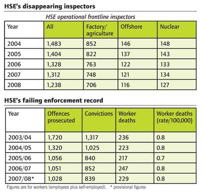 little interest in big injuries But when given the opportunity to introduce new penalties which would allow it to take more enforcement action with less bureaucracy, HSE has opted for business as usual. It has just waived its right to apply for new civil sanctions open to enforcement agencies under the Regulatory Enforcement and Sanctions Act, which become law in summer 2008. The Act allows regulators to apply to the minister for new powers designed to provide more appropriate and efficient alternatives to criminal prosecution. These sanctions include fixed monetary penalty notices - on-the-spot fines - or variable fines. There is also provision in the Bill for enforcement undertakings, legal agreements where the offender has to carry out specific activities to improve health and safety. HSE, though, maintains “there was no 'enforcement gap' for health and safety enforcers, and hence no need for HSE and local authorities to adopt these alternative penalties”. Other workplace safety regulators do not agree. The Local Authorities Coordinators of Regulatory Services (LACORS), has expressed irritation at the HSE move, which ruled out new enforcement approaches for local authorities as well as HSE. Both safety professionals’ body IOSH and TUC said they thought the failure to take up alternative penalties was a missed opportunity. The Health and Safety (Offences) Act which came into effect in October 2008 and introduces the possibility of larger fines and jail sentences, only came into being as a result of a private member’s bill by a back bencher, not a government move. And new explicit health and safety duties on directors were ruled out again last year by the government. Instead HSE cooked up voluntary guidance with the Institute of Directors – guidance early indications suggested was having little impact. In December 2008, HSE is expected to launch a consultation on a new strategy. But this will not be an ambitious blueprint for better enforced, more safe and more just workplaces. It will be linguistic acobatics, presenting a neutered watchdog as still relevant. Expect talk of “targeted inspections”, meaning some workplaces may never be targeted at all. Expect calls for partnership and voluntary action and cooperation and awareness-raising, meaning more hand-wringing and less enforcement. Expect nothing. For many, when it comes to enforcement, that will be as good as it gets.