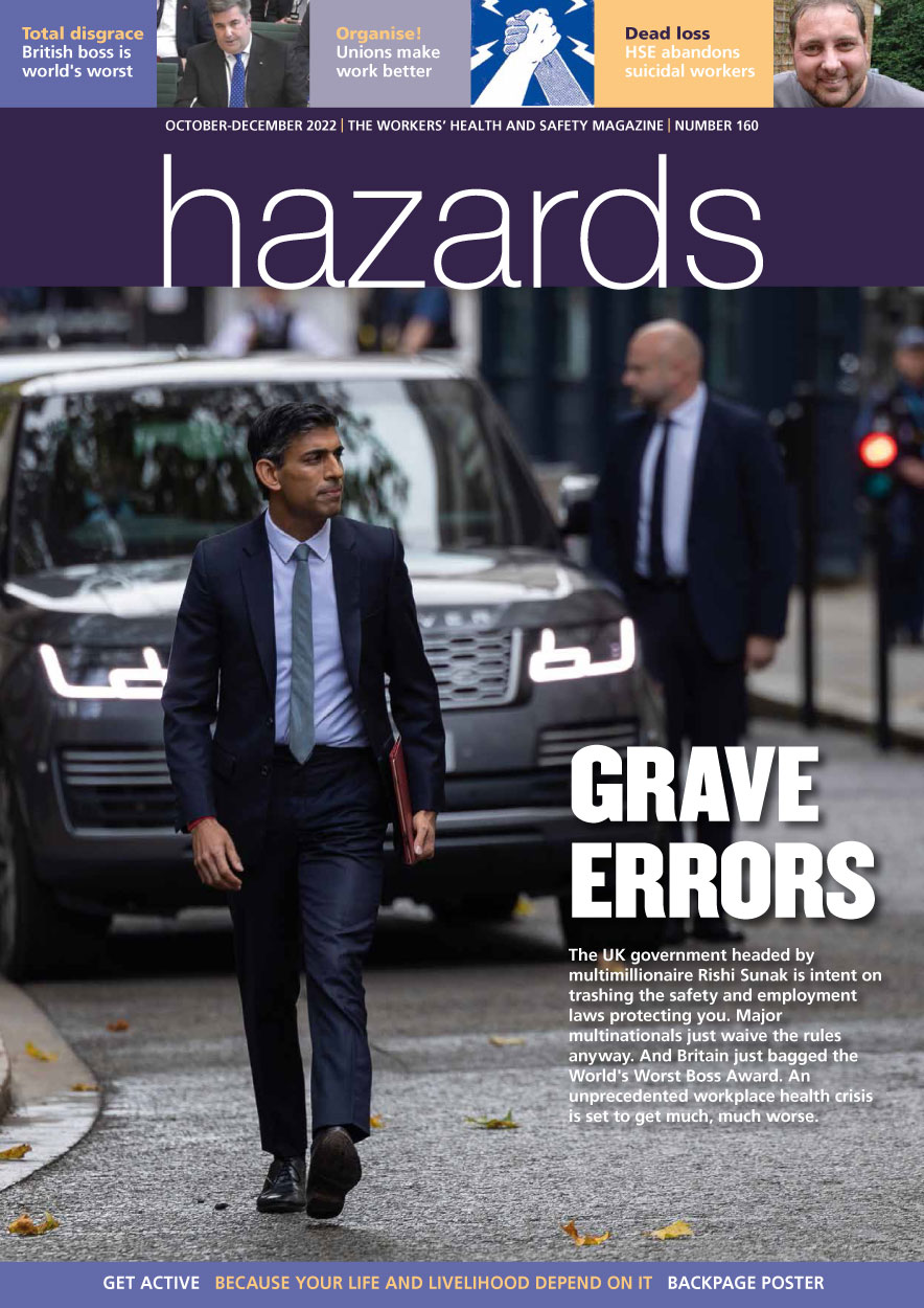Multimillionaire prime minister Rishi Sunak wants to dismantle the safety and employment laws protecting you. Top multinationals just ignore these laws anyway. And Britain just bagged the worst boss in the world award. Hazards editor Rory O’Neill warns an unprecedented workplace health crisis is set to get much, much worse.