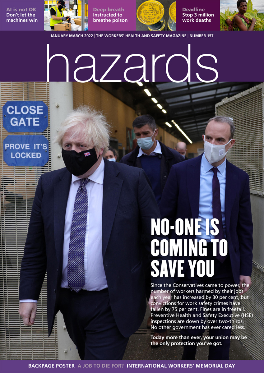 Since the Conservatives came to power, the number of workers harmed by their jobs each year has increased by 30 per cent, but convictions for criminal safety offences have fallen by 75 per cent. Preventive Health and Safety Executive (HSE) inspections are down by over two-thirds. Fines are in freefall. Hazards editor Rory O’Neill says this is no accident, it a policy of criminal neglect.. more