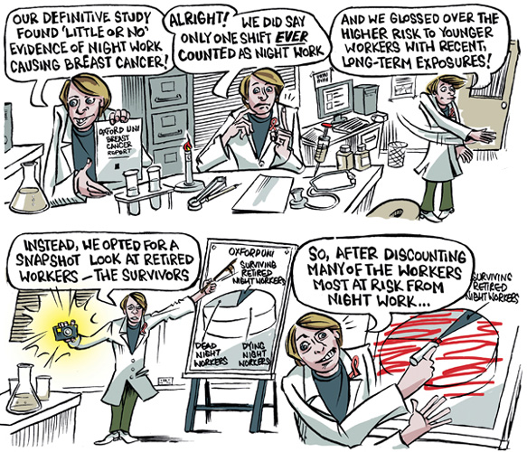 An HSE-backed Oxford University study concludes the classification of night work as a cause of breast cancer ‘is no longer justified’. Cancer Research UK says women should be ‘reassured’. But Hazards discovered the research may have got it seriously wrong, with devastating consequences for prevention.