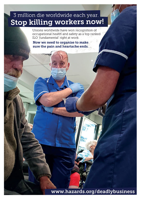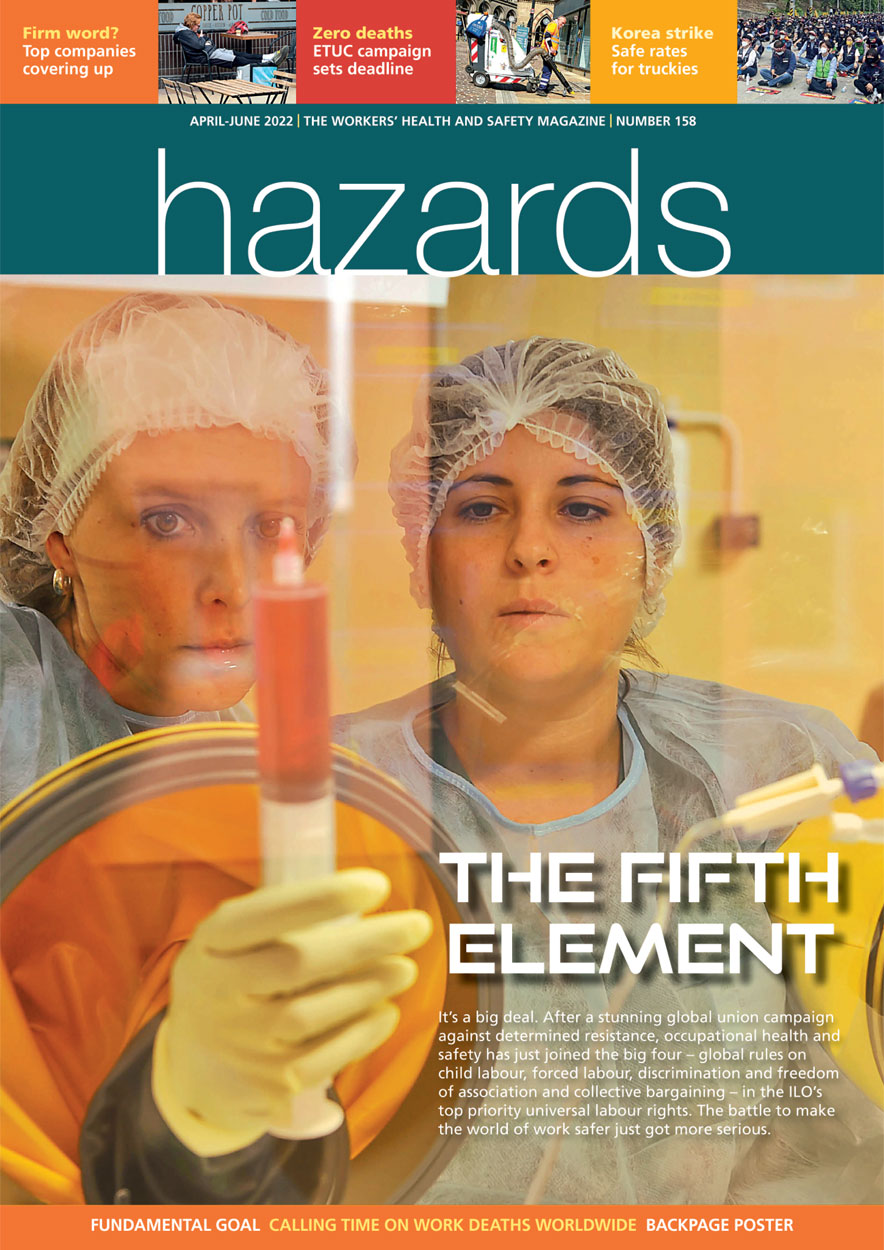 Action call as safety becomes an ILO 'fundamental' right at work. A Hazards pin-up-at-work poster.