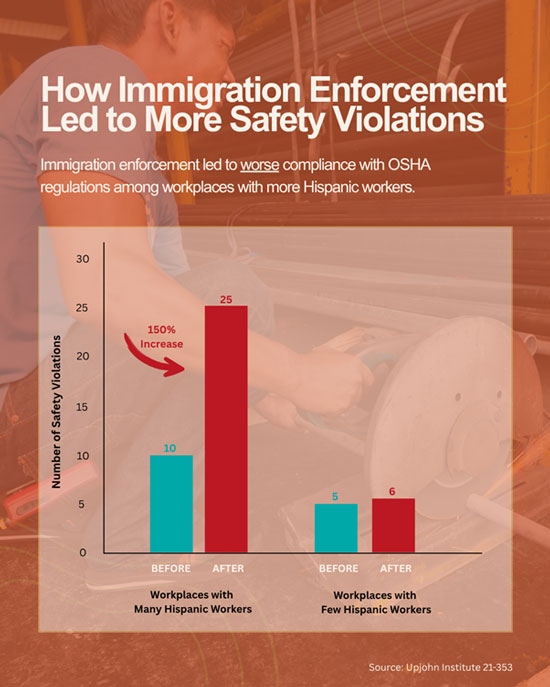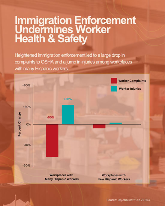 Researchers from the Upjohn Institute for Employment Research examined data from the ‘Secure Communities’ partnership between federal Immigration and Customs Enforcement (ICE) agents and local law enforcement from the 2010s. They document dramatic negative impacts of immigration enforcement on worker health and safety.