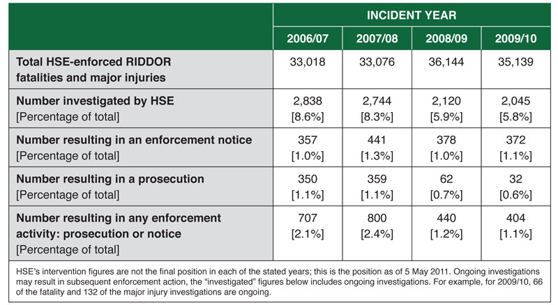 HSE prosecutions sank to a record low in 1009/10, with just 735 convictions secured. And figures obtained exclusively by Hazards show just 1 in 19 major injuries at work – a scalping, blinding, the loss of a limb or two – resulted in even a visit from HSE in 2009/10 [Table 1].