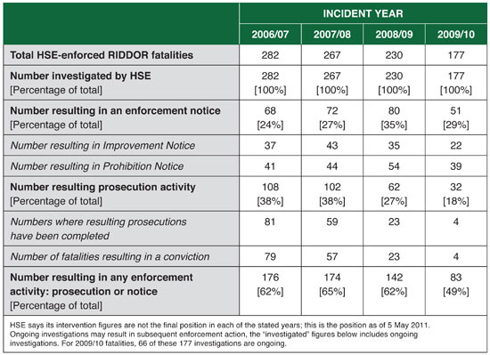 Justice is already in short supply. In every year since 2006, only a minority of fatalities reported to HSE have been followed by a prosecution and over a third resulted in no enforcement action at all [Table 2]. Of the 70,000 major injuries reported to HSE in the two years from 2008/09 to 2009/10, less than 1 in every 50 had as of May 2011 resulted in any official enforcement action [Table 3].