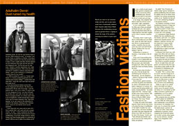 Fashion victims Would you want to see someone choke and die, just so your jeans could have a fashionably battered look? Hazards discovers the sandblasting process used by garment firms is ripping to shreds the lungs of the workers churning out billions of pairs each year. more |