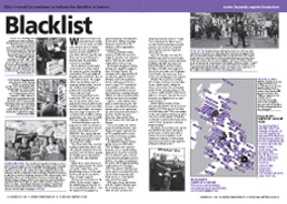 Blacklist Thousands of workers on a construction blacklist lost their livelihoods as a result. A Hazards photofile features the stunning Blacklist Support Group campaign that exposed collusion between employers and the police and inaction by the government. more |