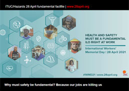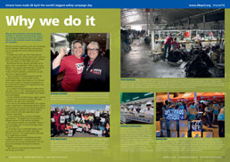 | Why we do it Why do union members across the globe mobilise on 28 April, demonstrating, inspecting, training and using all manner of creative means to put workplace health and safety in the spotlight? Because deaths caused by work are increasing and on Workers’ Memorial Day unions send out a message they won’t stand by and let it continue. more |