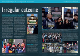 Irregular outcome A few days before his death, Kim Yong-kyun joined a “selfie campaign,” posting on social media a photo of himself holding a sign reading: “Mr President, please meet with temporary workers to repeal unfair labour laws, to punish illegal outsourcers, and to replace temporary jobs with regular ones.” Hazards 145, 2019 • more |