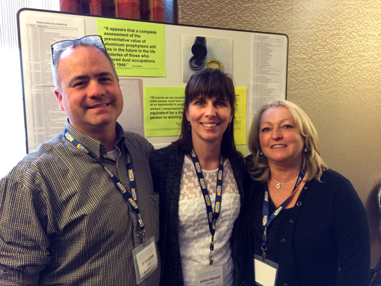 DISEASE REGISTERED In April 2015, Martell started a volunteer registry to determine how many former miners had health issues, and how these might related to McIntyre Powder exposure. There are now well over 500 individuals on the list. Over 50 have developed Parkinson's Disease. Martell (centre) teamed up with JP Mrochek of the USW Local 6500 and Sylvia Boyce, the health and safety coordinator with USW District 6, to organise occupational disease advice and mapping clinics.