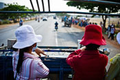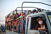 PRESSING PROBLEM Workers travelling home from a garment factory in Phnom Penh have little time to recover from a gruelling day at work, where demanding production targets can make breaks to eat, rest or use the toilet near impossible.
