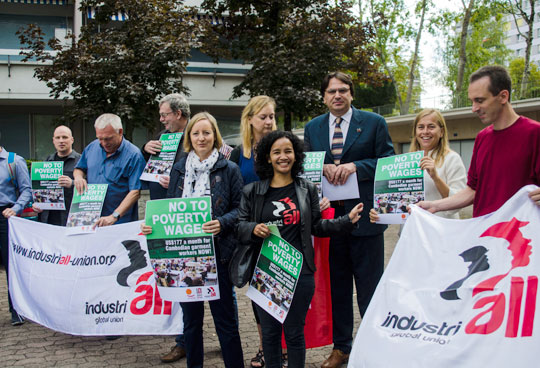 POVERTY PAIN Global union IndustriALL and the International Trade Union Confederation (ITUC) condemned a November 2014 decision by the Cambodian government to set a minimum wage of US$128 a month for the garment sector. Following a global day of action just weeks earlier, major High Street fashion retailers including Primark and H&M announced they were prepared to pay more for clothes made in Cambodia, so suppliers could pay a “fair living wage.” Instead of responding positively to the pressure, the Cambodian government announced a further clampdown on unions.